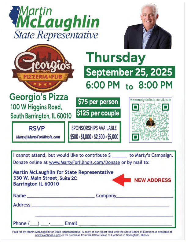 Join Marty for a fundraiser at Georgio’s Pizza in South Barrington.